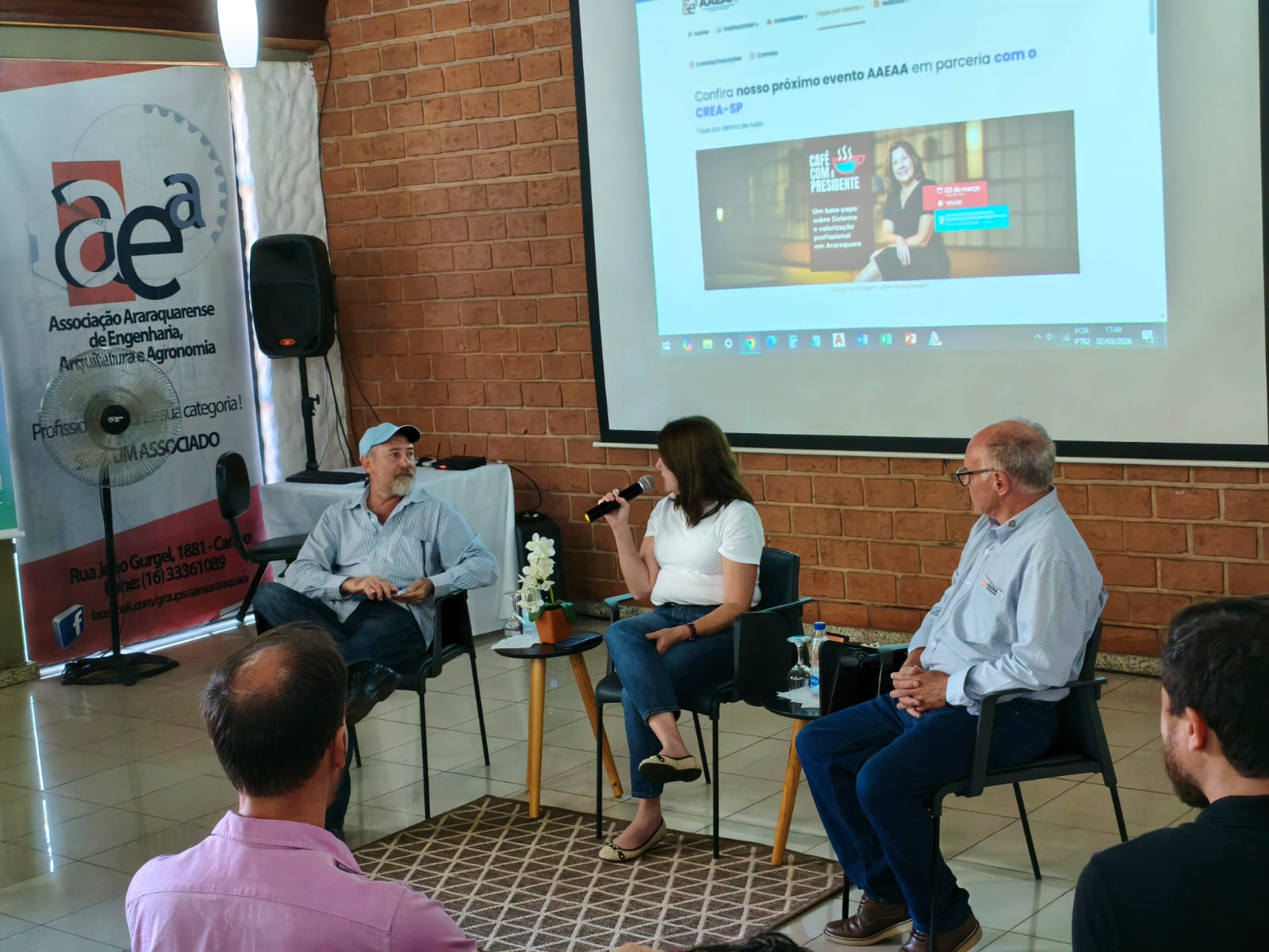 A abertura do evento foi marcada pelas palavras de boas-vindas do nosso presidente da AAEAA, o Engenheiro Agrimensor José Carlos de Campos, e do vice-presidente, o Engenheiro Civil Luis Carlos Cambiaghi Zanella. Sentados à mesa principal ao lado de Lígia, ambos agradeceram a presença expressiva do público e ressaltaram a importância dessa oportunidade ímpar de diálogo. O clima acolhedor de networking já havia começado logo na recepção, embalado por um delicioso café da tarde servido a todos os presentes.
